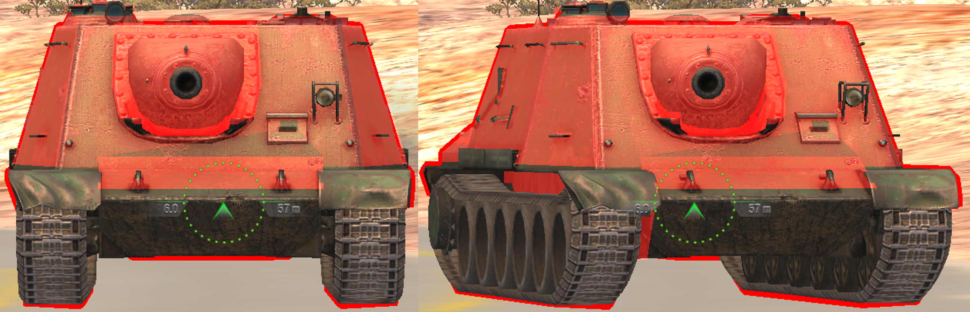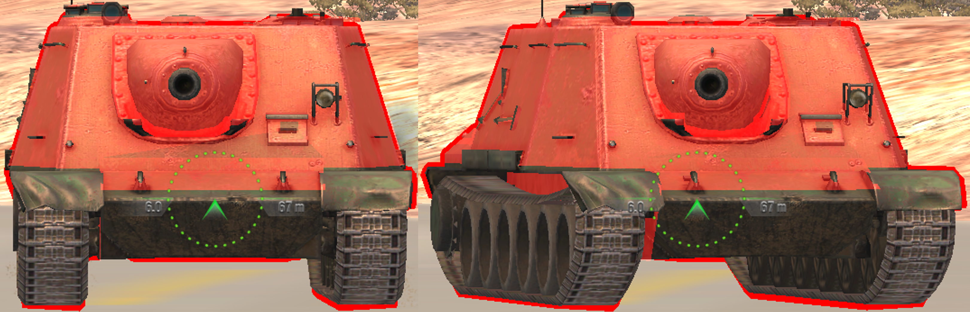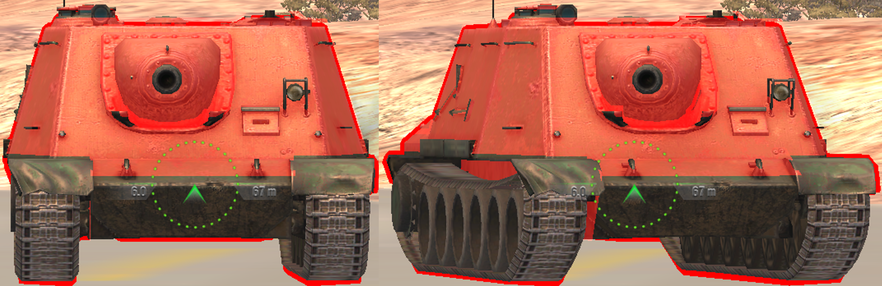 Though there’s no image, its pretty easy to imagine what it looks like when using gun depression, and as the tank’s front is largely just a few flat plates, all that changes is how much penetration is needed.