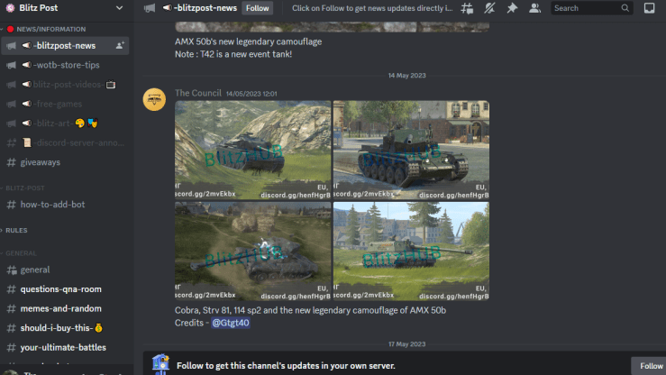 Below are some examples of the different content in the BlitzPost server, however there are other channels not shown here such as the best replays, QnA, clan recruitment, and game discussion channels.