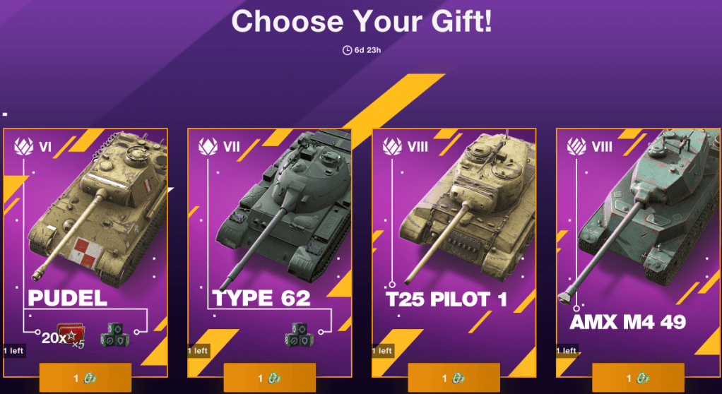 -For claiming the Pudel, Type 62, Å koda T 45, T25 Pilot 1, AMX M4 49, Keiler, or Caernarvon AX, if you already owned the tank you claim, you will receive 2,500 gold.