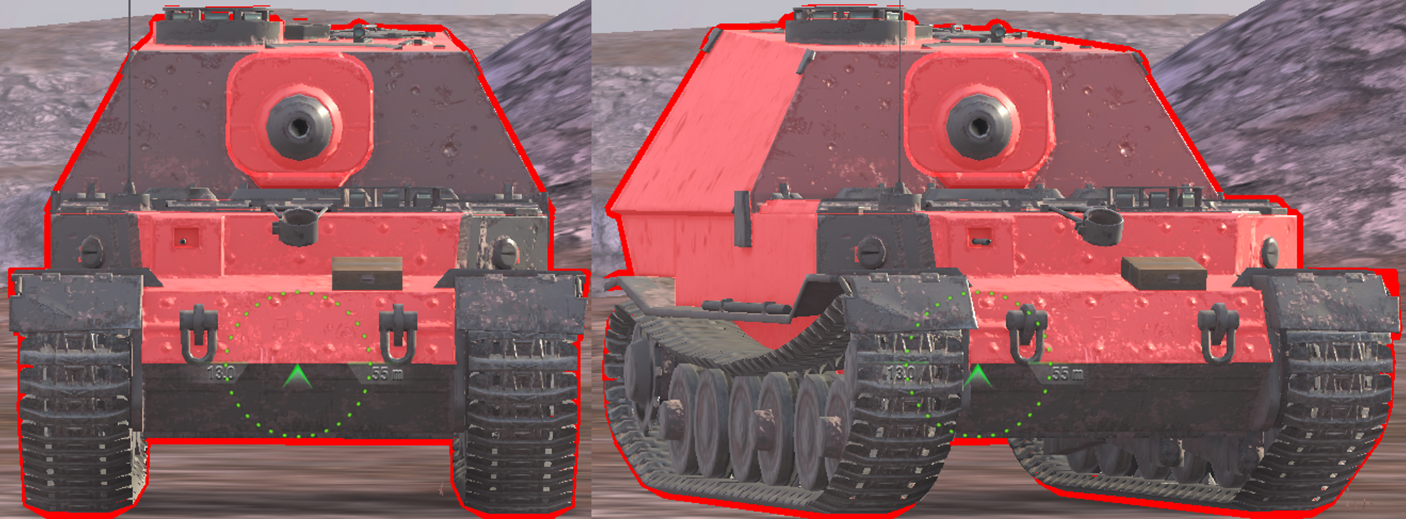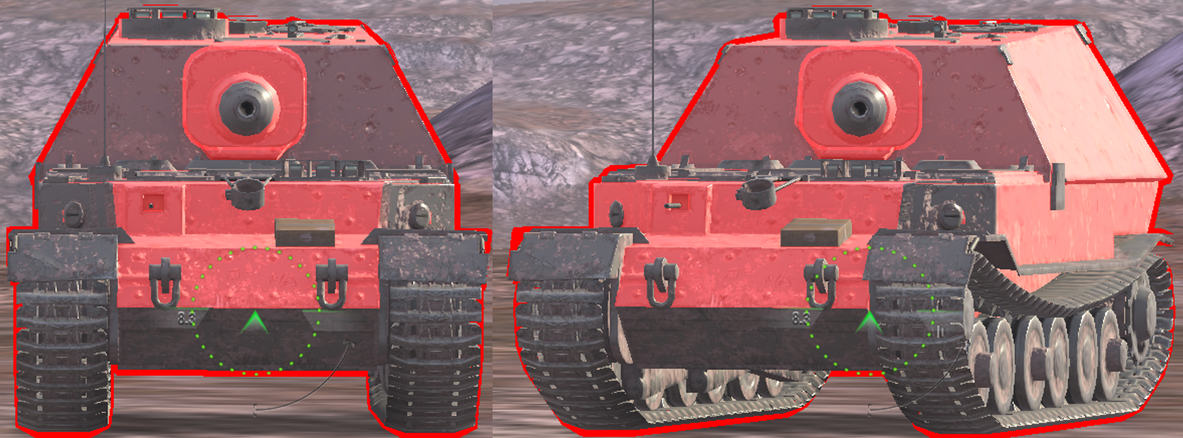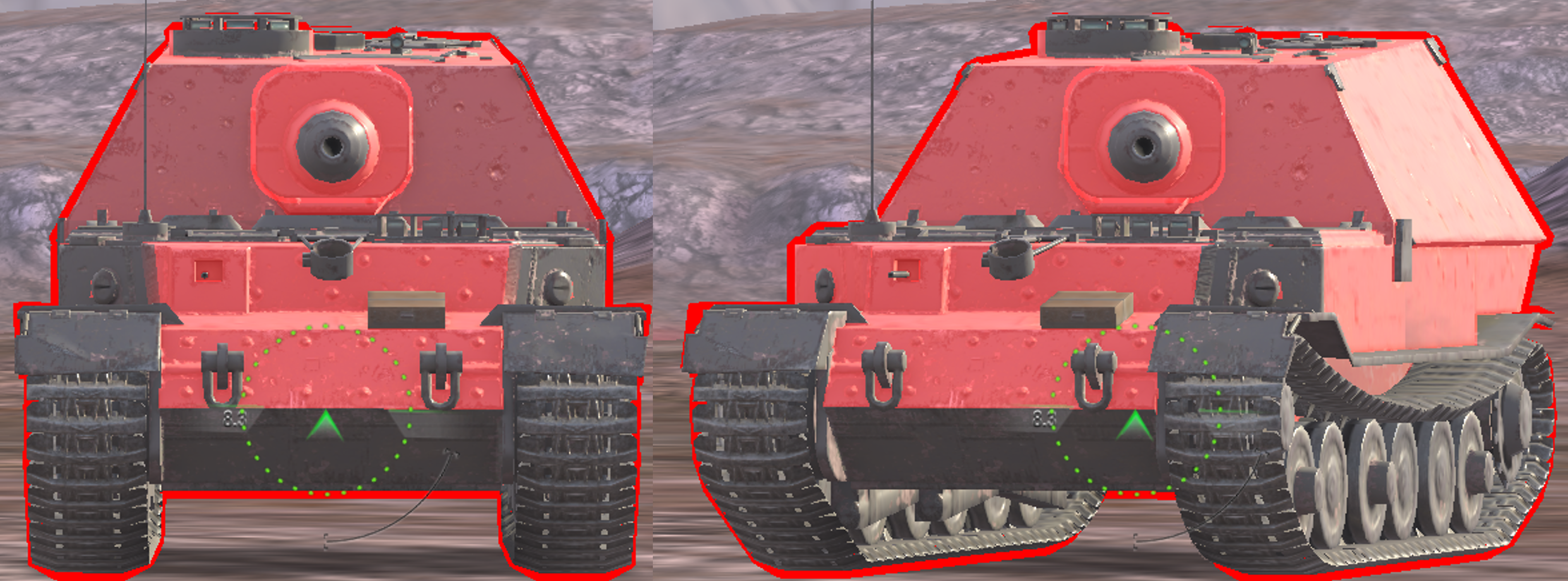 -The the 2nd image shows the tank barely angling. One hull shoulder is hidden, but the other is exposed, and the superstructure is barely angled.