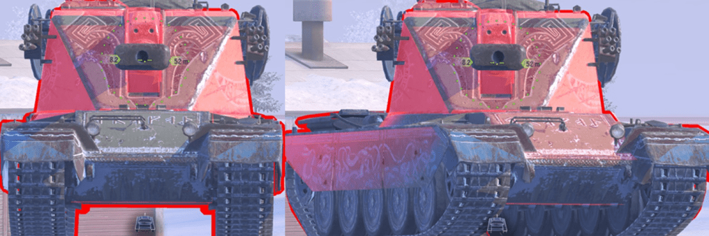 -All medium tanks (not including Centurions and TVP), are unable to penetrate the turret without using premium ammo. The upper plate will also appear red to most tanks with under 210mm of penetration.