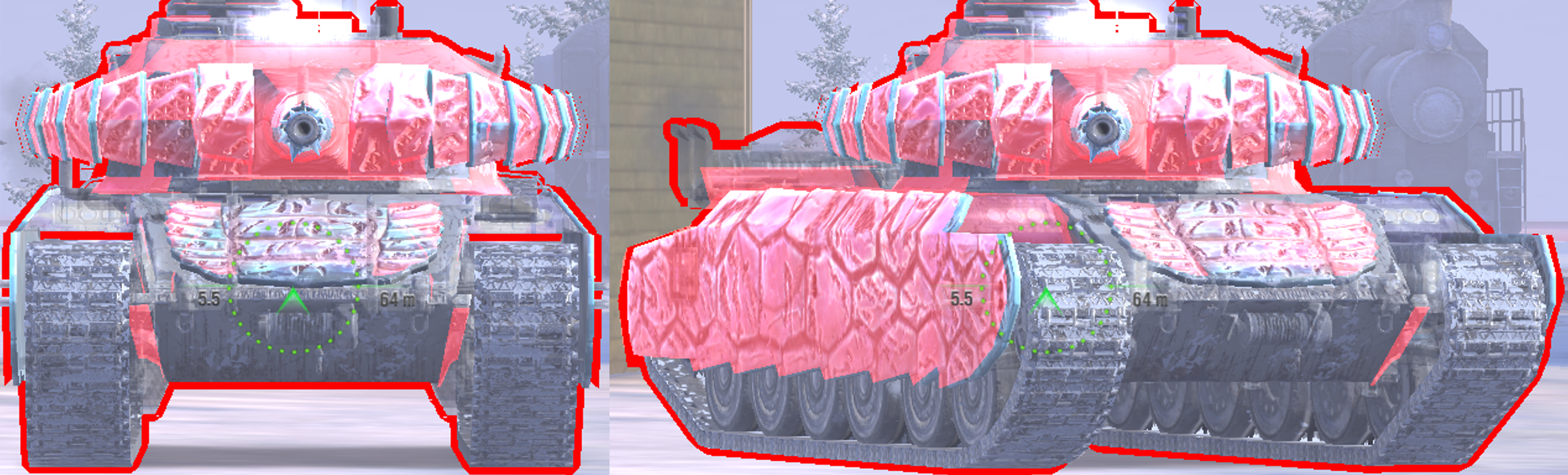 Note how in the right image, the track is exposed. Even though the armour behind it is red, the 240mm AP penetration can go through without any issue.