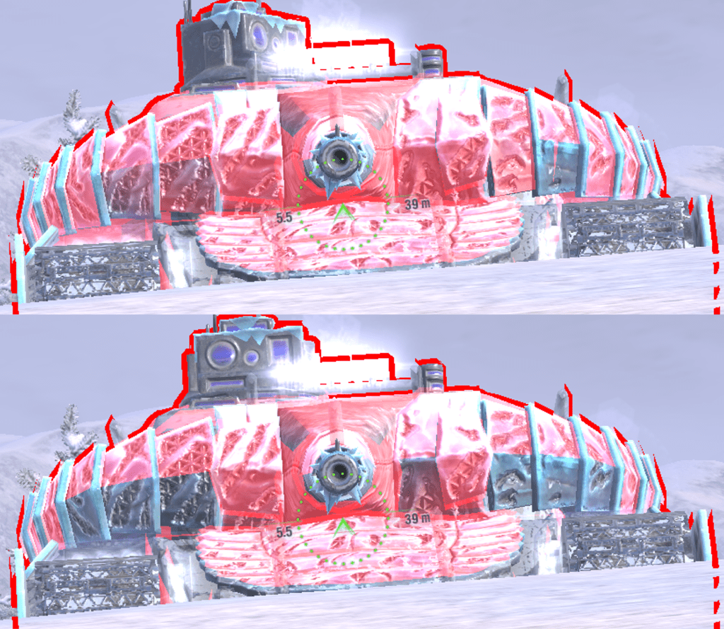 To many tier 8-9 tanks, the upper plate looks easily penetrable, since its effective thickness is just below the penetration level of most tier 9 tanks’ standard ammo (and some tier 8 or 10 tanks). This means if the hull turns, then it becomes red quite quickly, you can see this with the 227mm AP images.