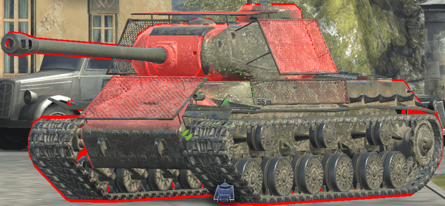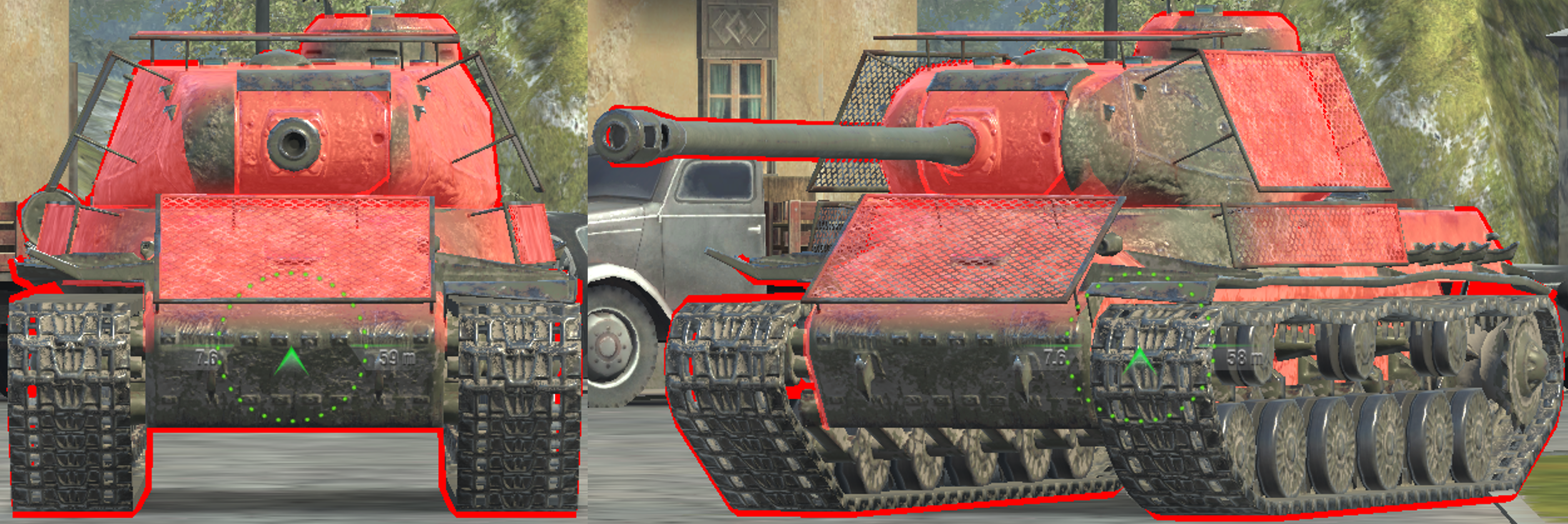 The front of the IS-2 Shielded has 3 weakpoints, the biggest of which is the lower plate. You should always look for positions where you can hide this behind cover, so that only the strong upper plate is showing.