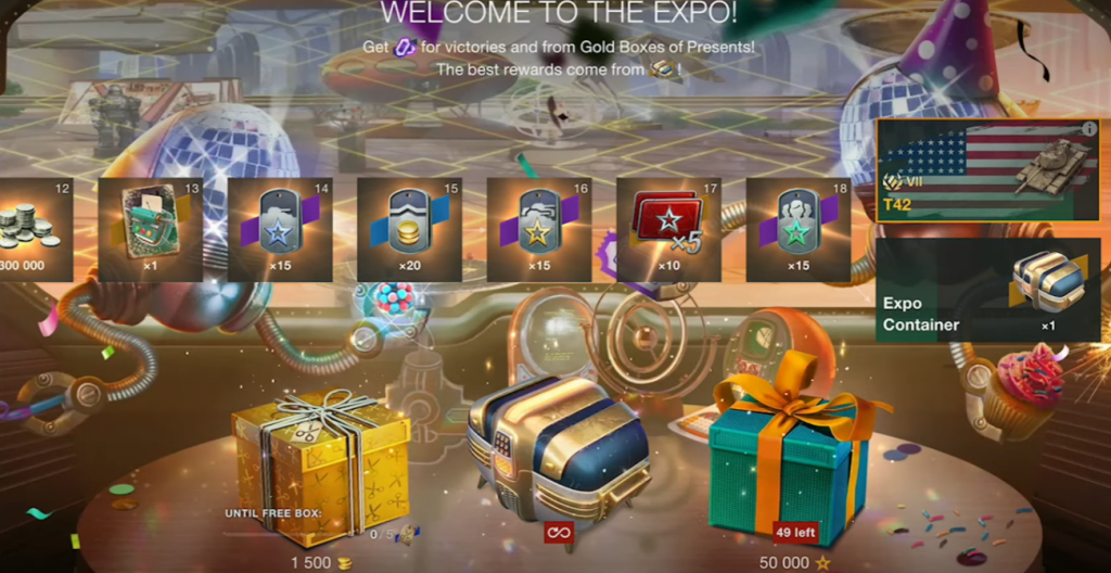 Much like the Blitz Fair event, you can buy gift boxes for either 1,500 gold or 50,000 free XP. The ones for gold have a 10% chance to drop an Expo container.