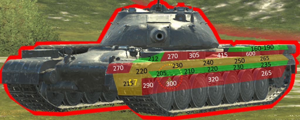 -The upper red area is high in thickness, and is curved inwards (similar to the Obj.140, Annihilator, and Škoda T56’s upper sides), which creates a very troll angle and very strong armour.