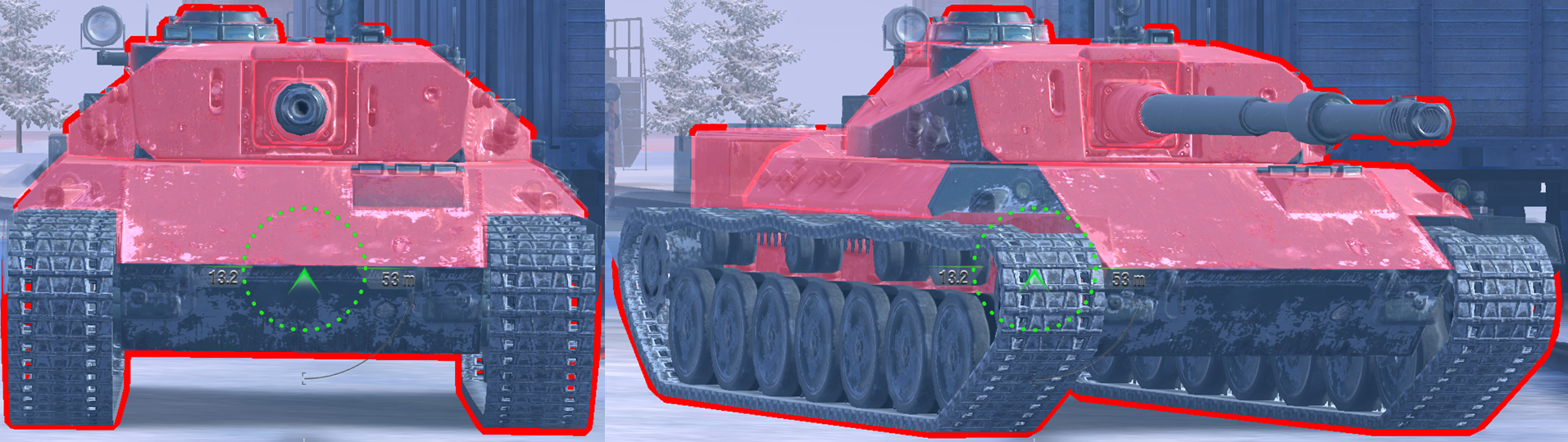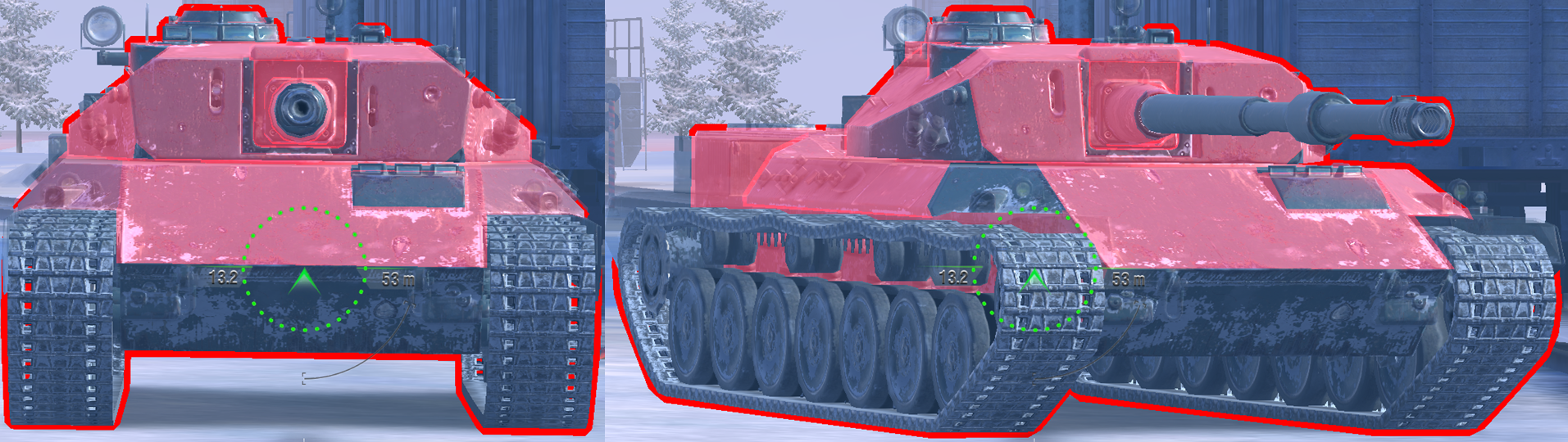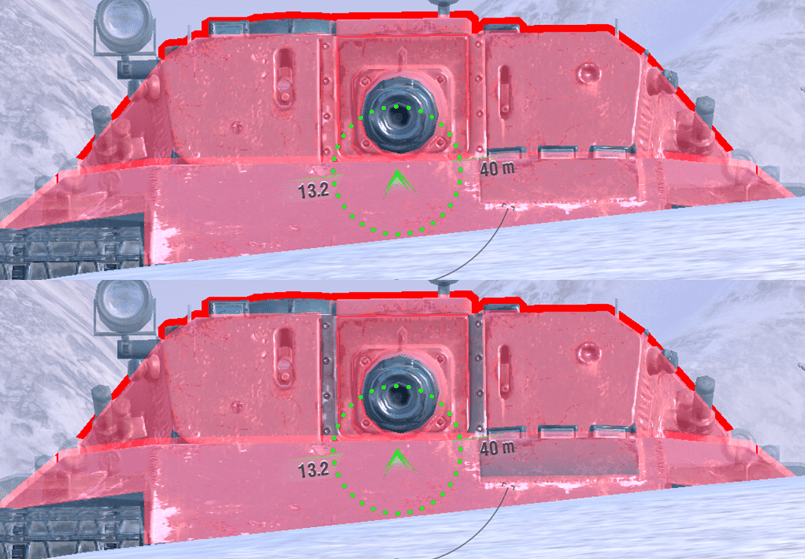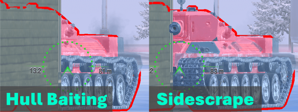 Sidescraping in the Sentinelle isn’t as effective as other sidescraper tanks, as the Sentinelle has a weakpoint on its hull shoulder (shown in the right image)