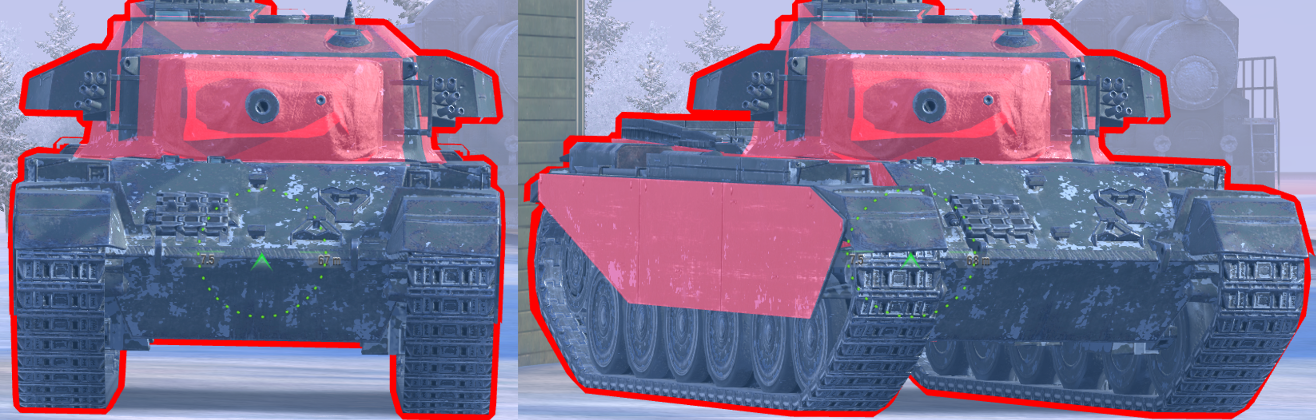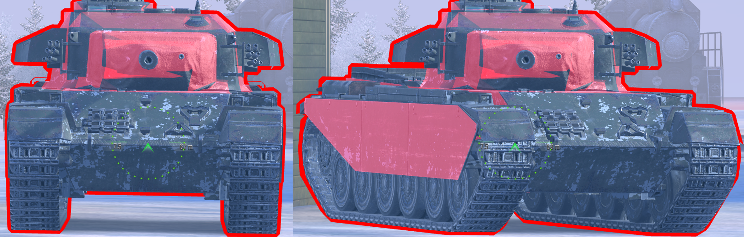 Both tanks in the images are using enhanced armour, and facing against 218mm AP penetration.