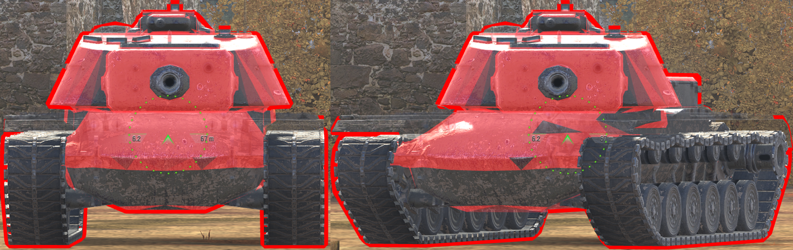 The sides are angled similar to the other T110 tanks and the M48, with a boat like shape, which creates some decent angling. As stated above, its quite irrelevant due to the track wheel.