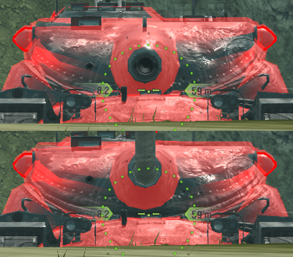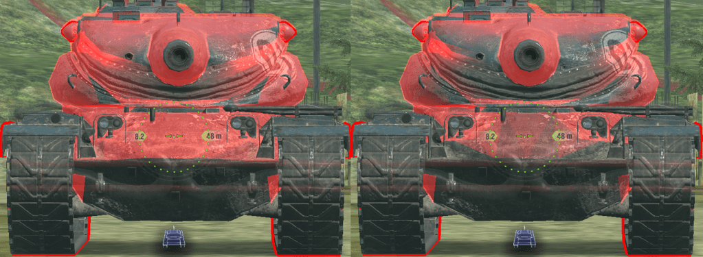 Turret: Roughly the same as above, since it oscillates down. Some areas are hidden as they go into the hull when using gun depression.