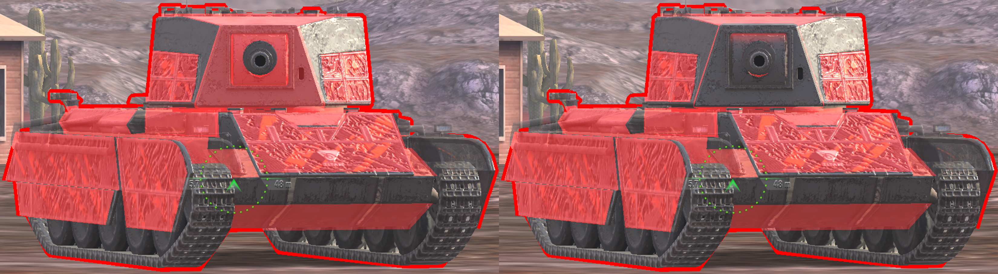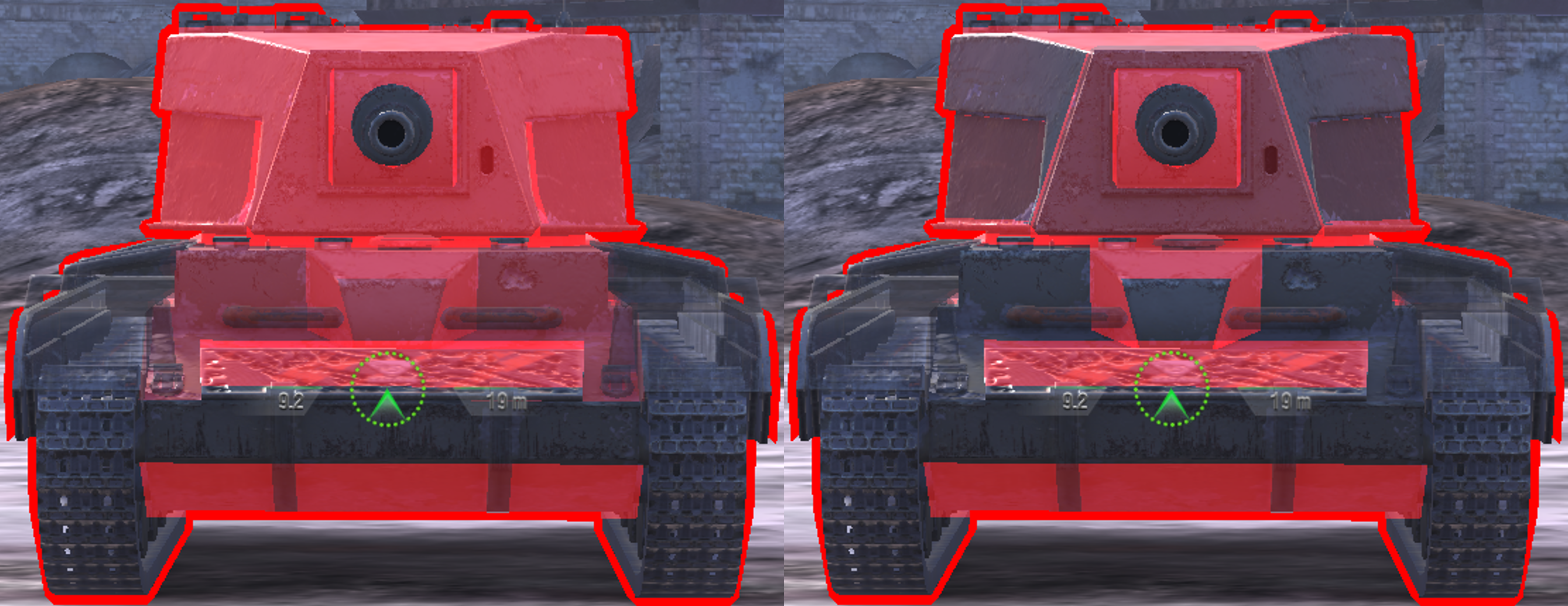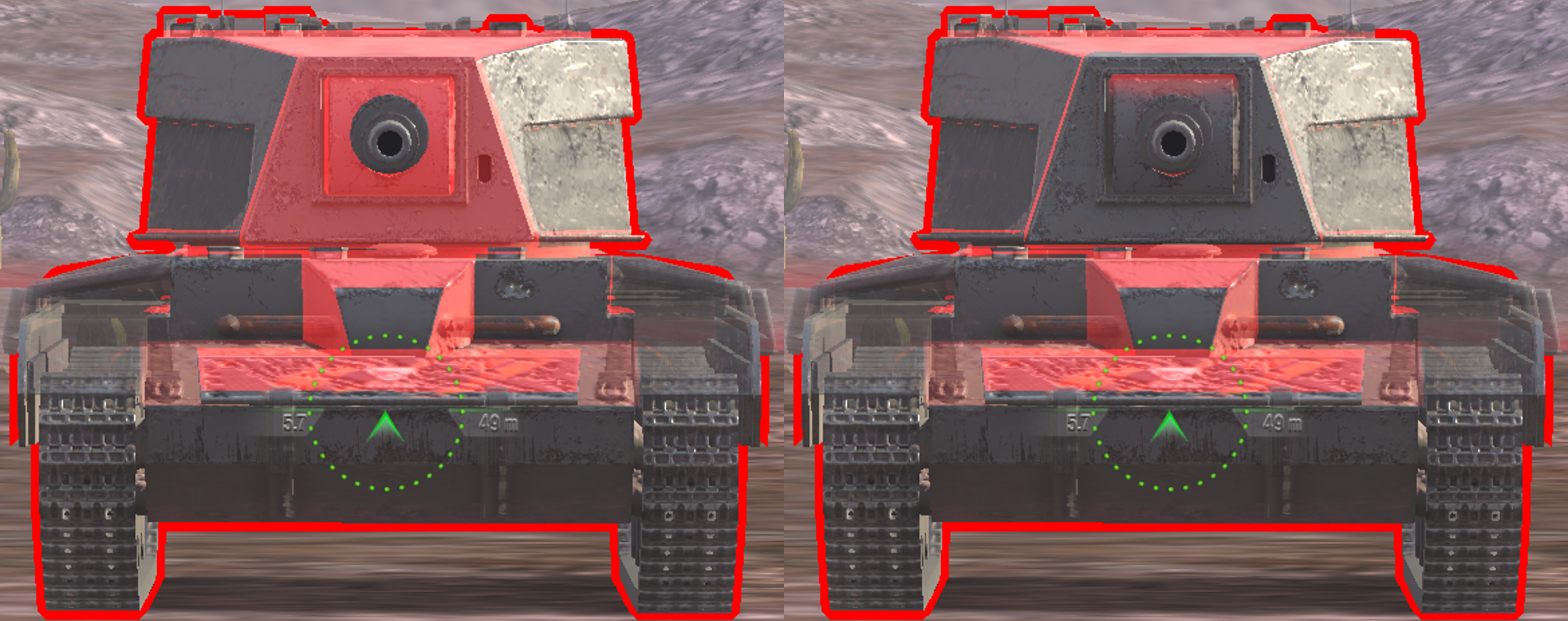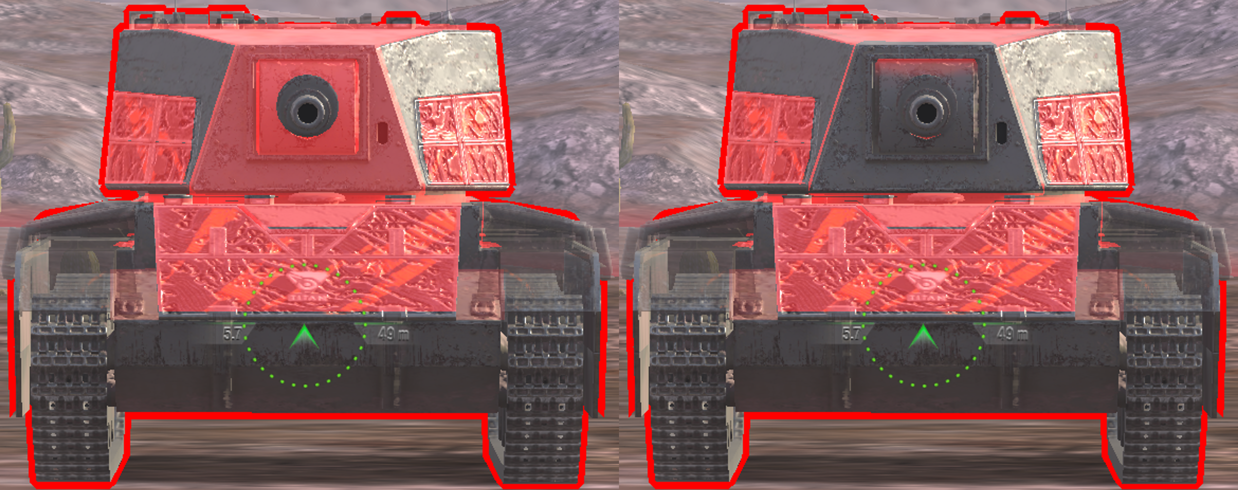 Despite having a higher effective armour number than the flat turret front, the turret cheeks are actually weaker. This is due to the turret front having high base thickness but poor angling, whereas the turret cheeks have good angling but low base thickness.