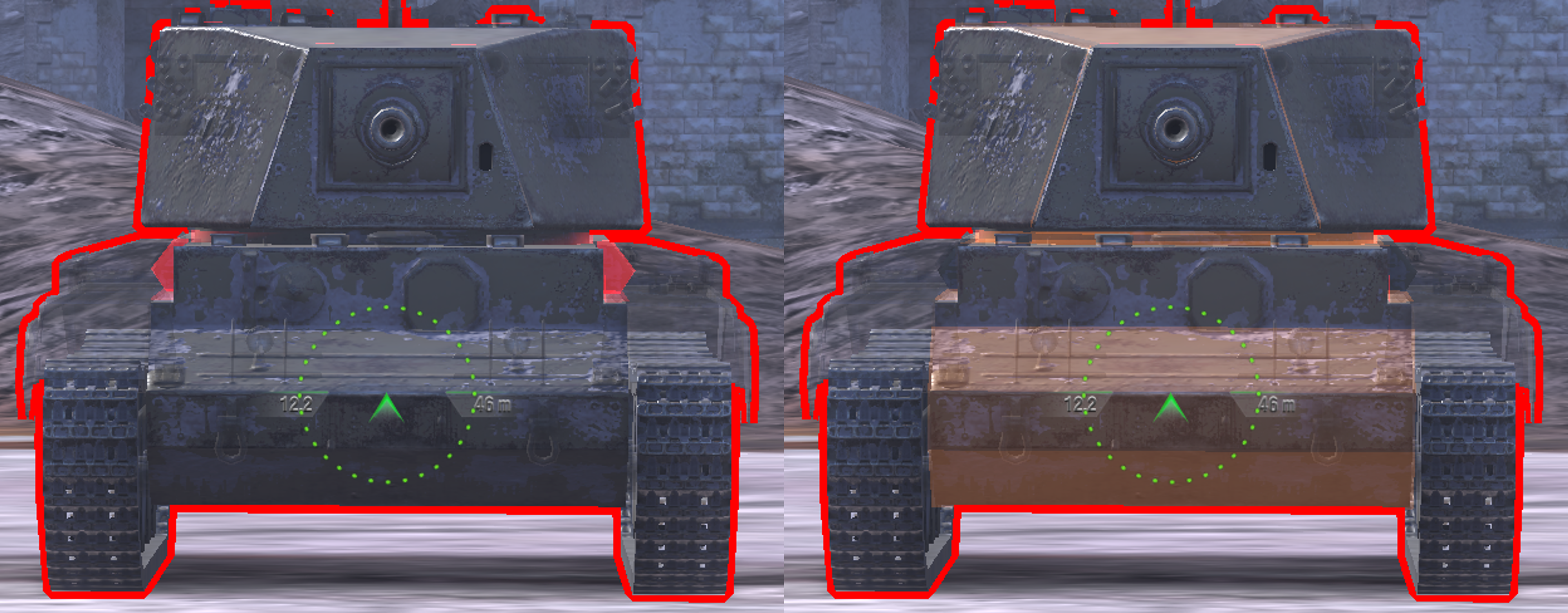 This area with spaced armour is between 124 and 144mm thick, making it troll to low penetration guns, even when over angled (see image below); and its able to bounce higher penetration guns if sidescraping properly.