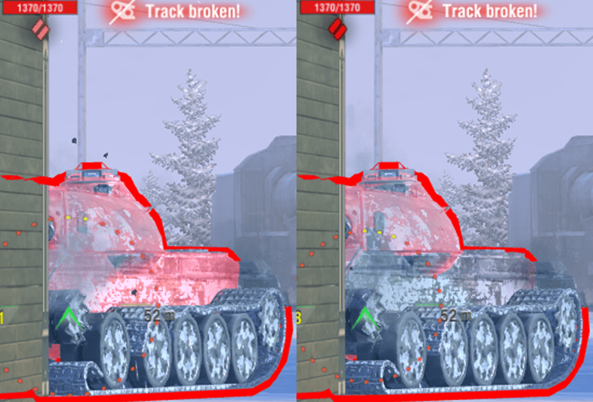 The right image shows how premium APCR can penetrate the hull, but gets absorbed by the tracks.