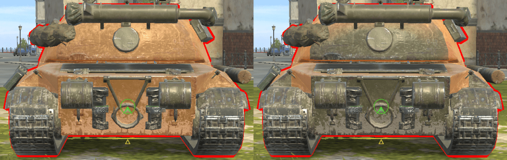 -Areas which are partially red (such as the upper plate in the left image, or the turret front in the right image), your shell has a chance to penetrate, but it also has a chance to bounce. (The more red and less transparent it is, the less likely it is to pen, and vice-versa.)