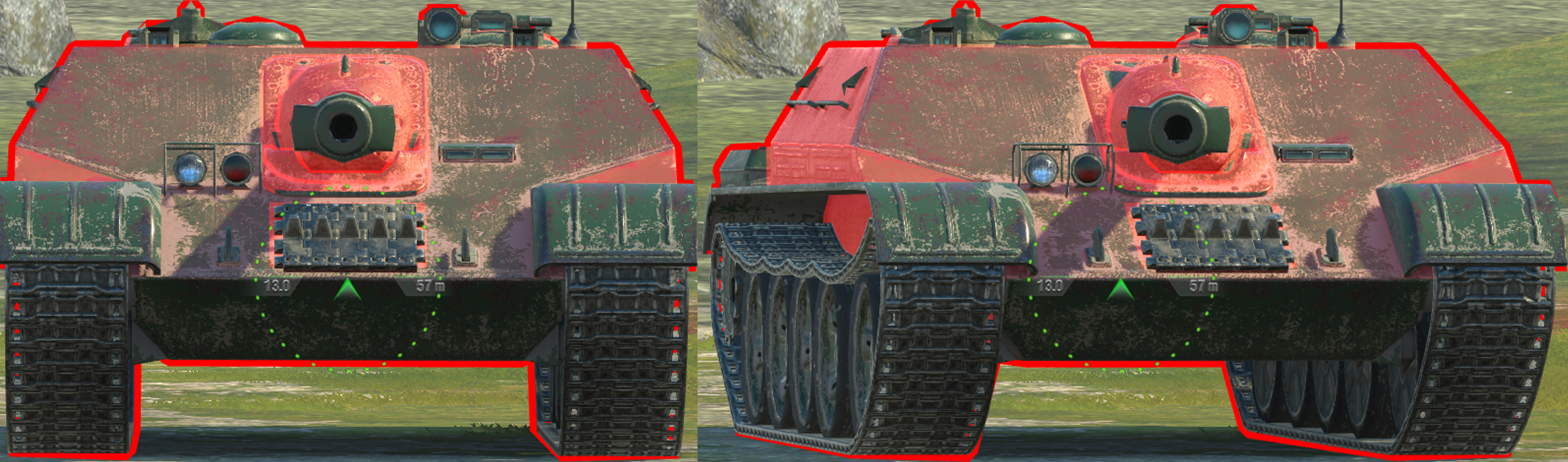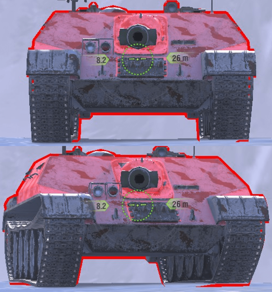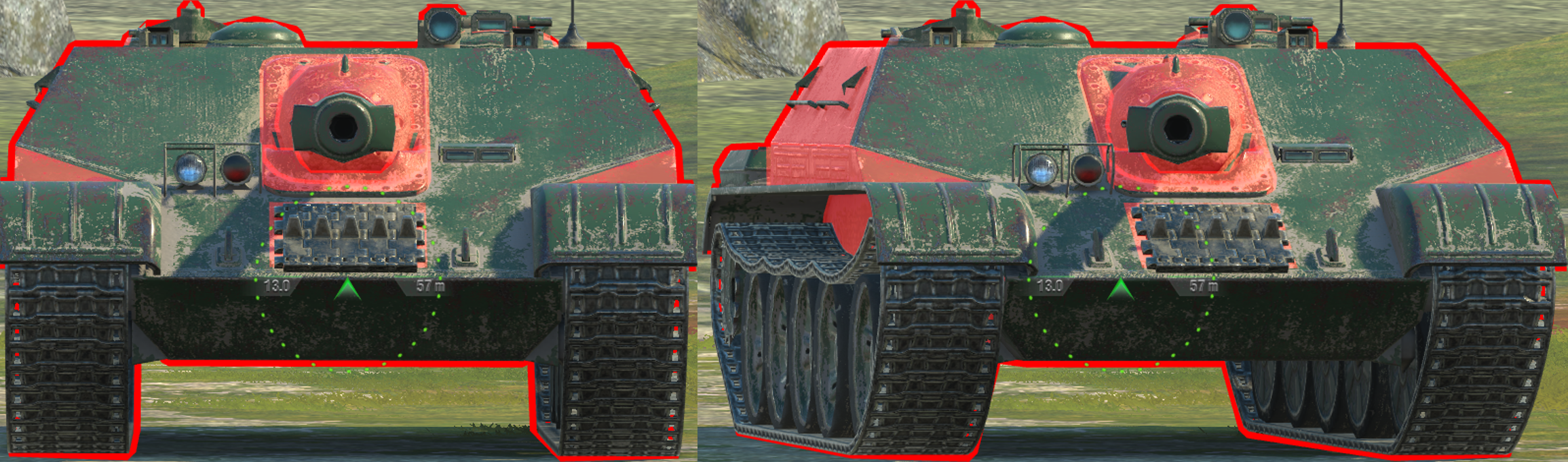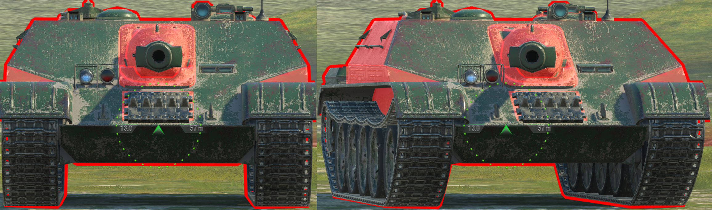 3- Track links on the upper plate, these aren’t just for decoration, they count as 20mm of armour. If you accidentally shoot here (or deliberately), you shot is much more likely to bounce. This area will not show up as red because the tracks are a visual element blocking the armour highlight.