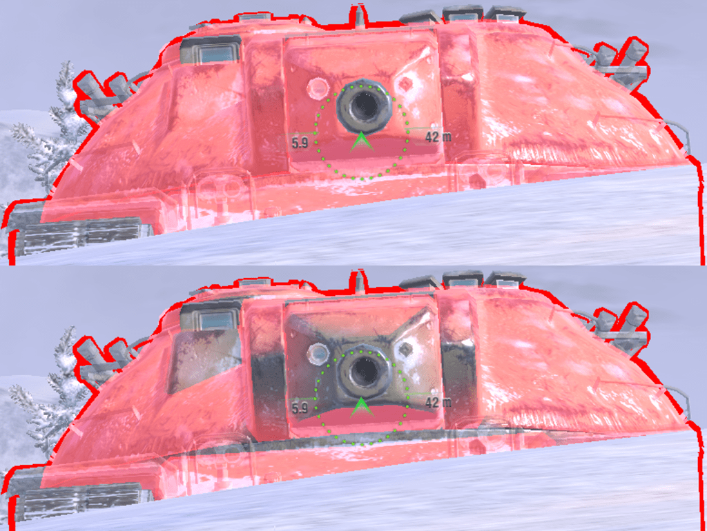 Its best not to shoot this, both on flat ground and when hulldown. You have to “thread the needle” between the bottom of the gun mantlet, and the top of the upper plate, both which are much thicker areas of armour.